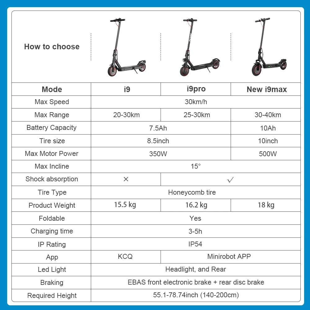 iScooter i9/i9pro/i9max Batterie 350/500W (7.5/10Ah) Roue 8.5''/10'' Trottinette Electrique