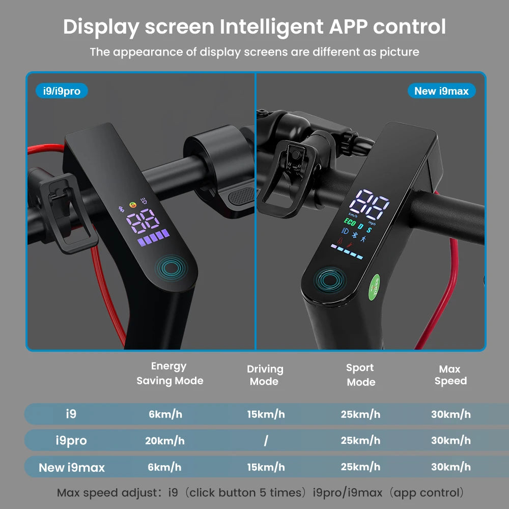 ��350W POWERFUL MOTOR - 2023 New Upgrade i9 E-Scooter 30 KM/H Top Speed. Start from a standstill without having to start, faster acceleration, easy climbing on hills and easier maneuverability off-road, especially on grass. You can freely set the speed limit (0 - 30 km/h) via the APP. Fully humanized design, you can set the maximum speed for different scenes and different people.
